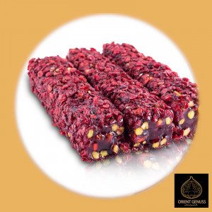 Zutaten: Zucker, Pistazien (14%), Maisstärke, Wasser, natürlicher Aromastoffe (Vanille, Granatapfel), Säureregulator (Zitronensäure E 330), Lebensmittel Farbstoff E 124.
